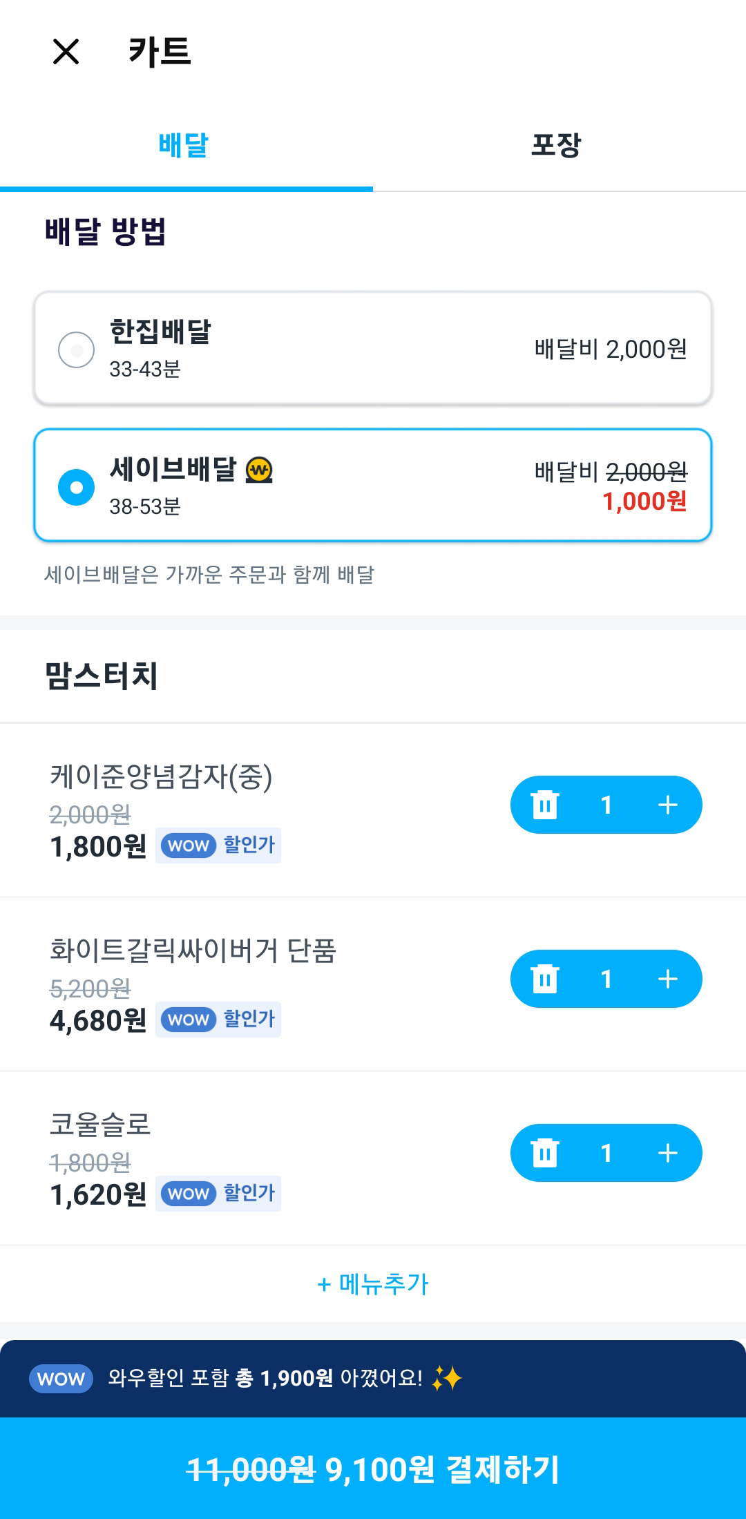 요즘 집에서 배달을 자주 시켜먹는데요~ 저는 쿠팡와우 회원이라서 쿠팡 로켓배송이나 쿠팡플레이를 잘 이용하고 있어요. 그런데 요즘은 쿠팡이츠도 와우 회원이면 음식값 10% 할인에 세이브 배달로 배달료도 할인해주더라구요. 물론 해당 안되는 매장도 있지만 점점 늘어나는 추세라서 요즘 쿠팡이츠 10% 할인받고 이것저것 많이 먹었어요.