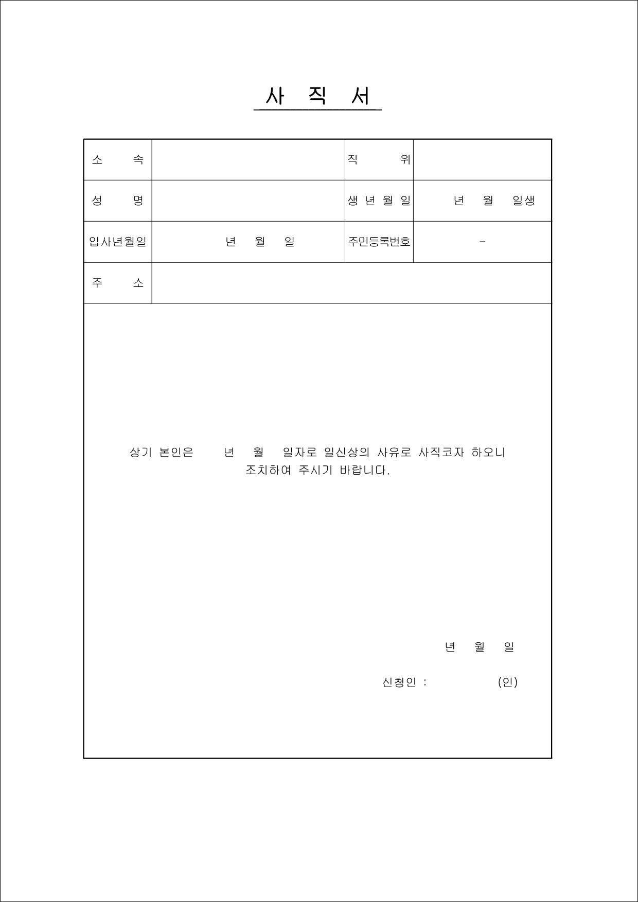 사직서는 근로자가 회사를 그만둘때(퇴직할때) 사직의사를 회사에 전달했다는 근거를 남기기 위해서 작성하는 문서양식 입니다. 보통 퇴직하기 한달정도 전에 사직서를 제출하고 퇴직 전에 인수인계 등을 마친 후 퇴직하는것이 일반적 입니다.