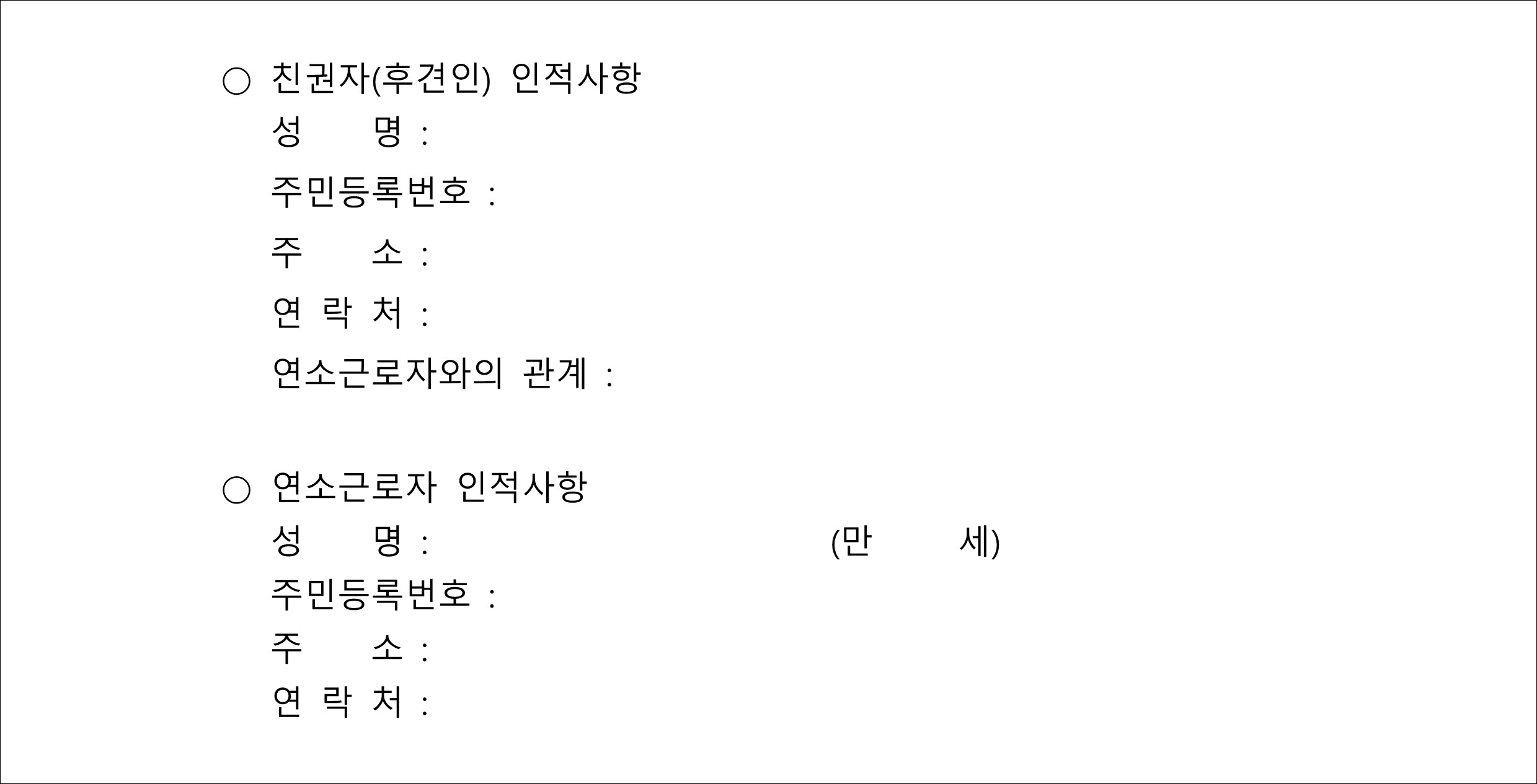 우선 친권자(후견인) 인적사항을 적어줍니다. 친권자는 친권을 행사할 수 있는 권리를 가진 사람으로 원칙적으로는 부모님 입니다. 그리고 알바를 할 연소근로자의 인적사항을 적어줍니다.