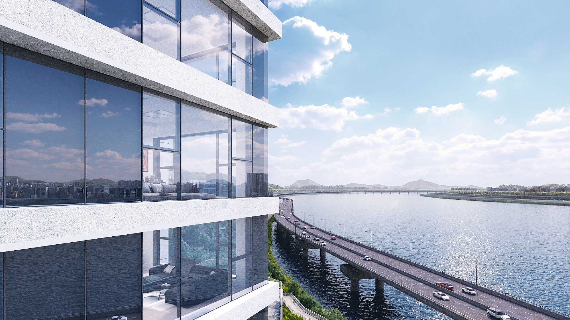 외관 디자인은 한강의 물결을 가르는 크루즈의 뱃머리와 요트의 돛을 모티브로한 곡선형 입면 파사드로 라인조명을 통해서 야간에도 입체적인 외관을 보여주도록 만들어집니다. 포제스 한강은 한강변 아파트를 이야기 할때 빼놓을 수 없는 새로운 랜드마크 단지가 될 것입니다.
