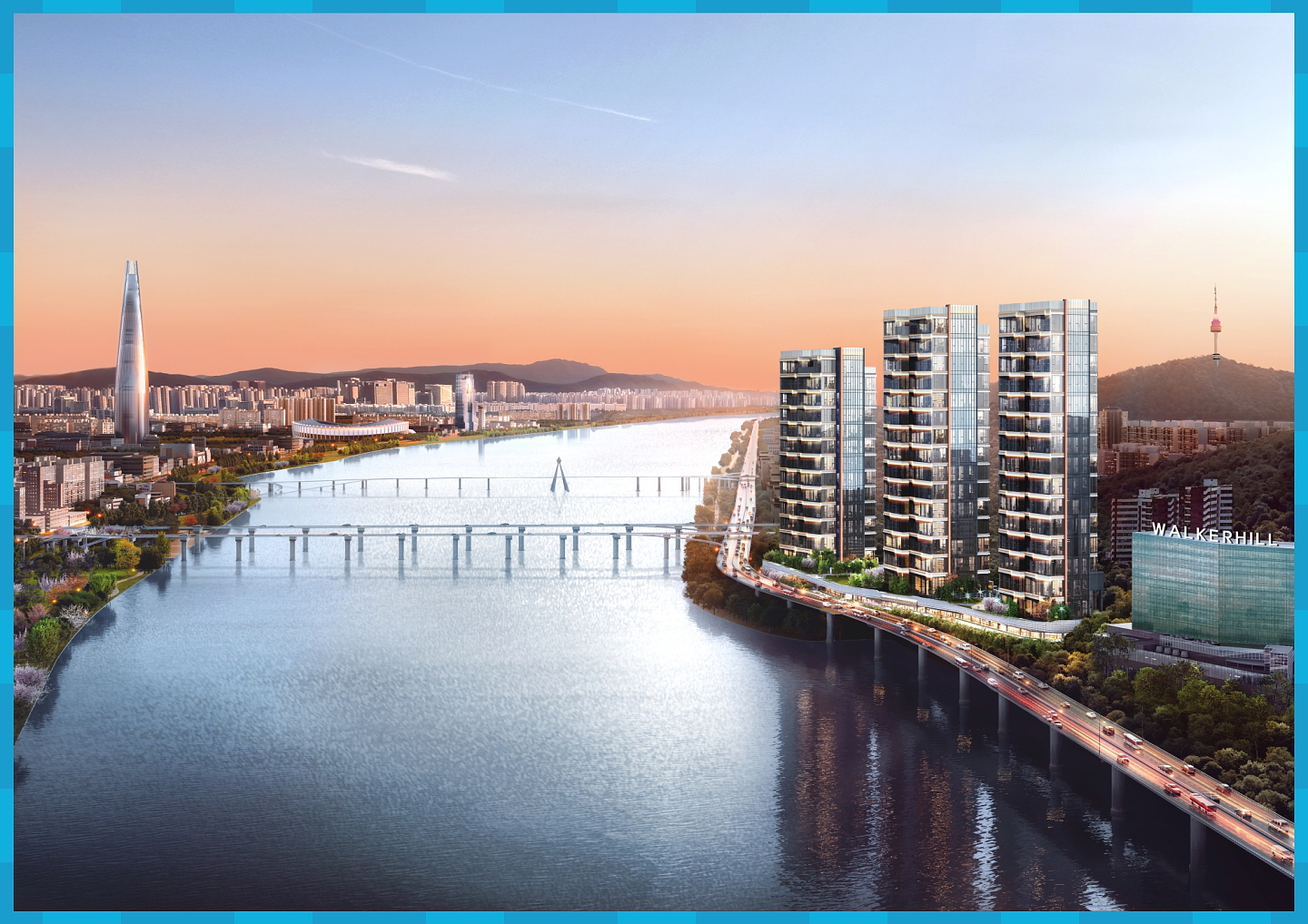 그럼 입지를 알아보겠습니다. 포제스 한강은 광진교 북단 바로 옆으로 광장동 한강호텔이 있던 자리에 들어섭니다. 위로는 워커힐호텔과 워커힐아파트가 있는 전통적인 부촌의 자리로, 아차산과 용마산이 뒤로 위치하고 한강이 앞에 흐르는 전형적인 배산임수의 명당 입니다.