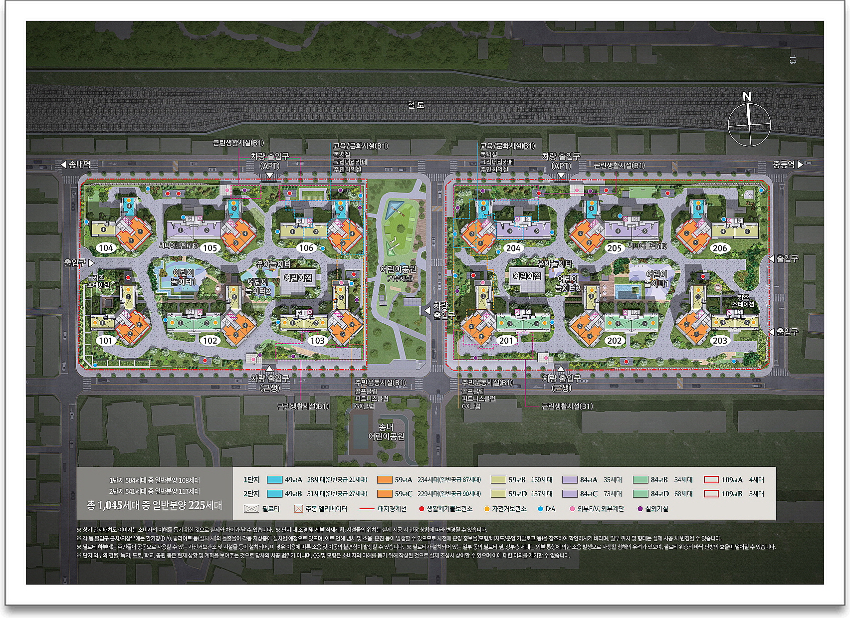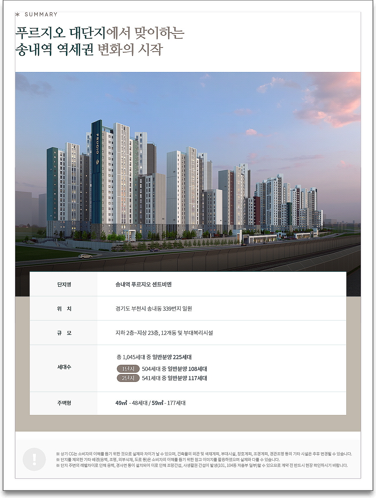 단지는 경기도 부천시 송내동 339번지 일원에 지하 2층 ~ 지상 23층까지 1단지 504세대, 2단지 541세대 총 1,045세대를 공급합니다. 이번에 진행중인 일반분양은 1단지 108세대, 2단지 117세대로 225세대를 분양중이며, 현재는 미분양 세대에 대한 잔여호실 계약을 진행하고 있습니다.