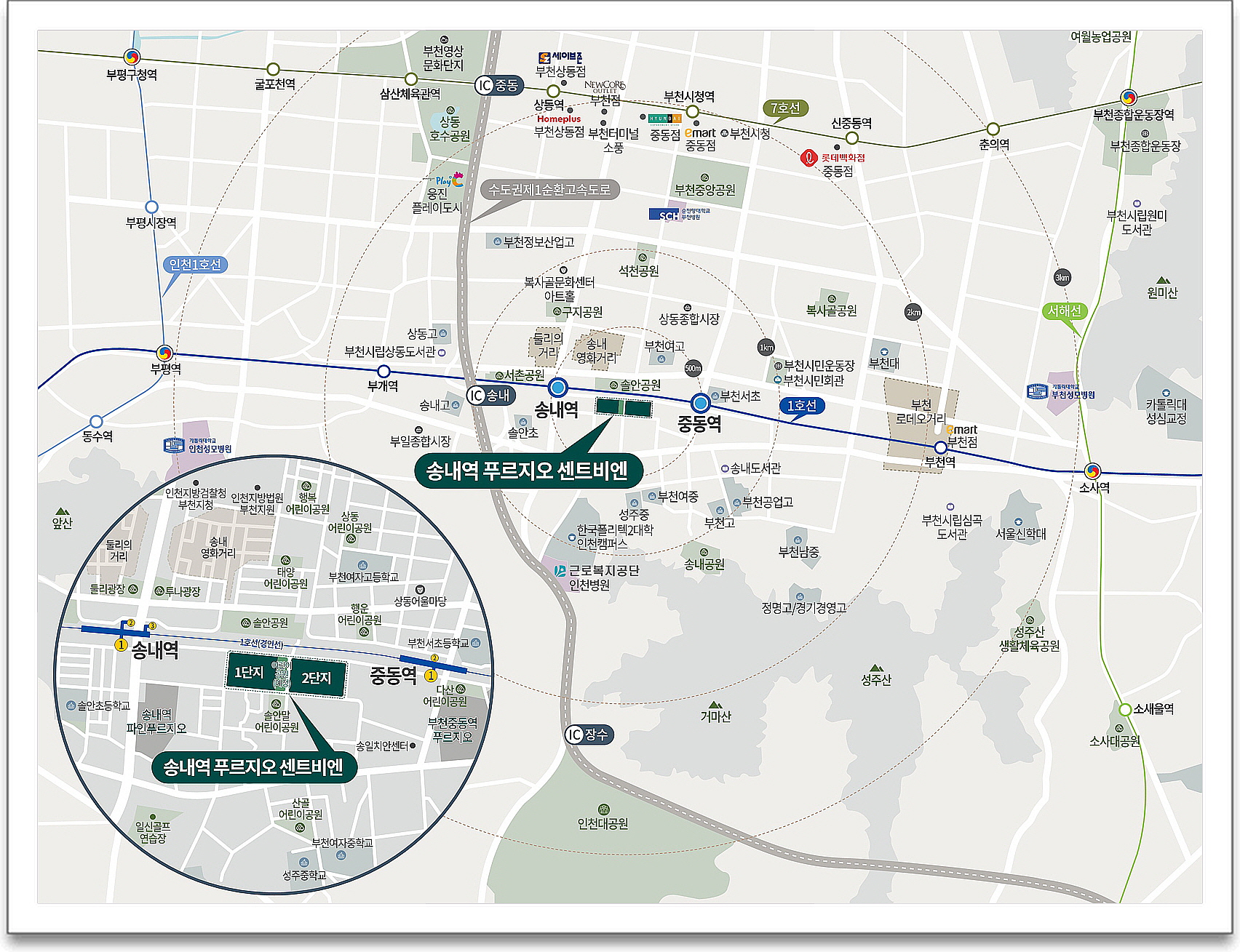 송내역 푸르지오 센트비엔 사업부지는 1호선 송내역과 중동역 사이에 위치합니다. 부천지역은 역세권에 신규 아파트 공급이 매우 적은 지역으로, 오랜만에 부천 지역에서 더블 역세권의 황금입지를 자랑하는 곳에 들어섭니다. 1호선 송내역 에서는 용산 특급과 급행 열차가 운행중으로 구로, 신도림, 영등포, 용산 등 서울 주요 지역으로 정말로 빠르게 이동할 수 있습니다. 그리고 수도권 제1순환고속도로 송내 IC, 중동대로, 장수 IC, 인천대공원 등도 가깝게 위치합니다.