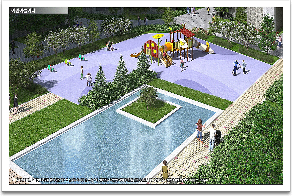 단지 중앙에는 기부체납으로 넓은 어린이공원이 조성되고, 단지 내부에도 유아놀이터, 어린이놀이터, 어린이집 등 아이들을 위한 쾌적한 공간이 조성됩니다.