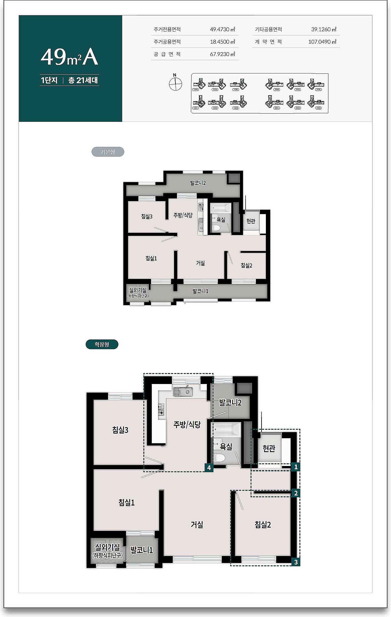 현재 분양중인 송내역 푸르지오 센트비엔 일반분양 세대는 전용면적 49㎡ 48세대, 전용면적 59 ㎡ 177세대를 분양하고 있습니다. 소형 아파트인 49㎡ 20 ~ 21평형 아파트는 3개의 방으로 구성되어 있어서 활용도가 정말로 좋은 공간을 자랑합니다.