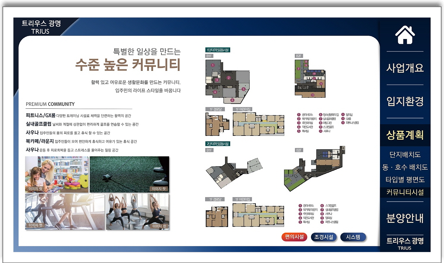 그리고 트리우스 광명 단지 안에서는 피트니스, GX룸, 사우나, 북카페, 라운지, 스크린골프, 실내골프클럽 등 다양한 커뮤니티시설을 이용할 수 있습니다.