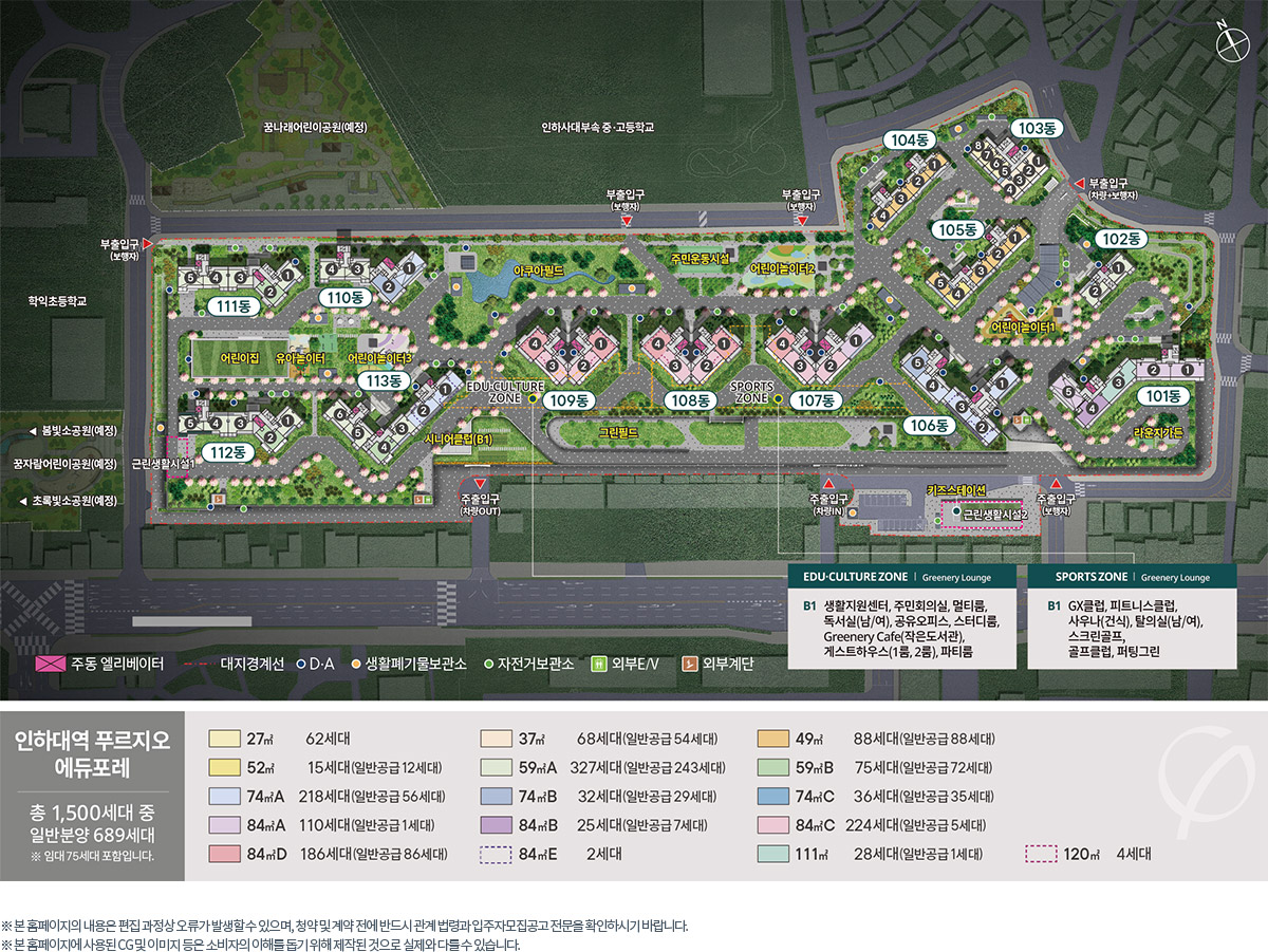 인하대역 푸르지오 에듀포레는 인천광역시 미추홀구 학익1동 321-35번지 일원에 지하 2층 ~ 지상 39층, 13개동, 아파트 총 1,500세대를 공급합니다. 일반분양은 689세대로 일반분양 잔여세대의 선착순 계약을 진행하고 있습니다.