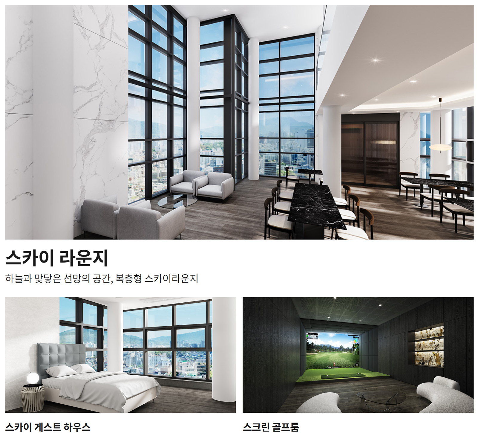 특히 평촌 아크로 베스티뉴는 하이엔드 단지 답게 단지 내 다양한 시설을 이용할 수 있는데요, 하늘과 맞닿은 복층형 스카리운지, 스카이 게스트 하우스, 스크린 골프룸,