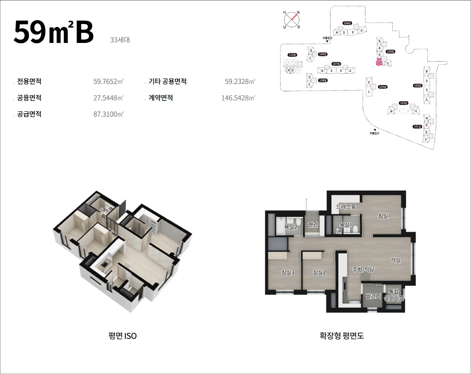 세대의 구성은 전용면적 39㎡(10세대), 59㎡ A(286세대), 59㎡ B(33세대), 74㎡ B(21세대), 84㎡ (41세대)로 중·소형 규모의 단지로 구성됩니다.