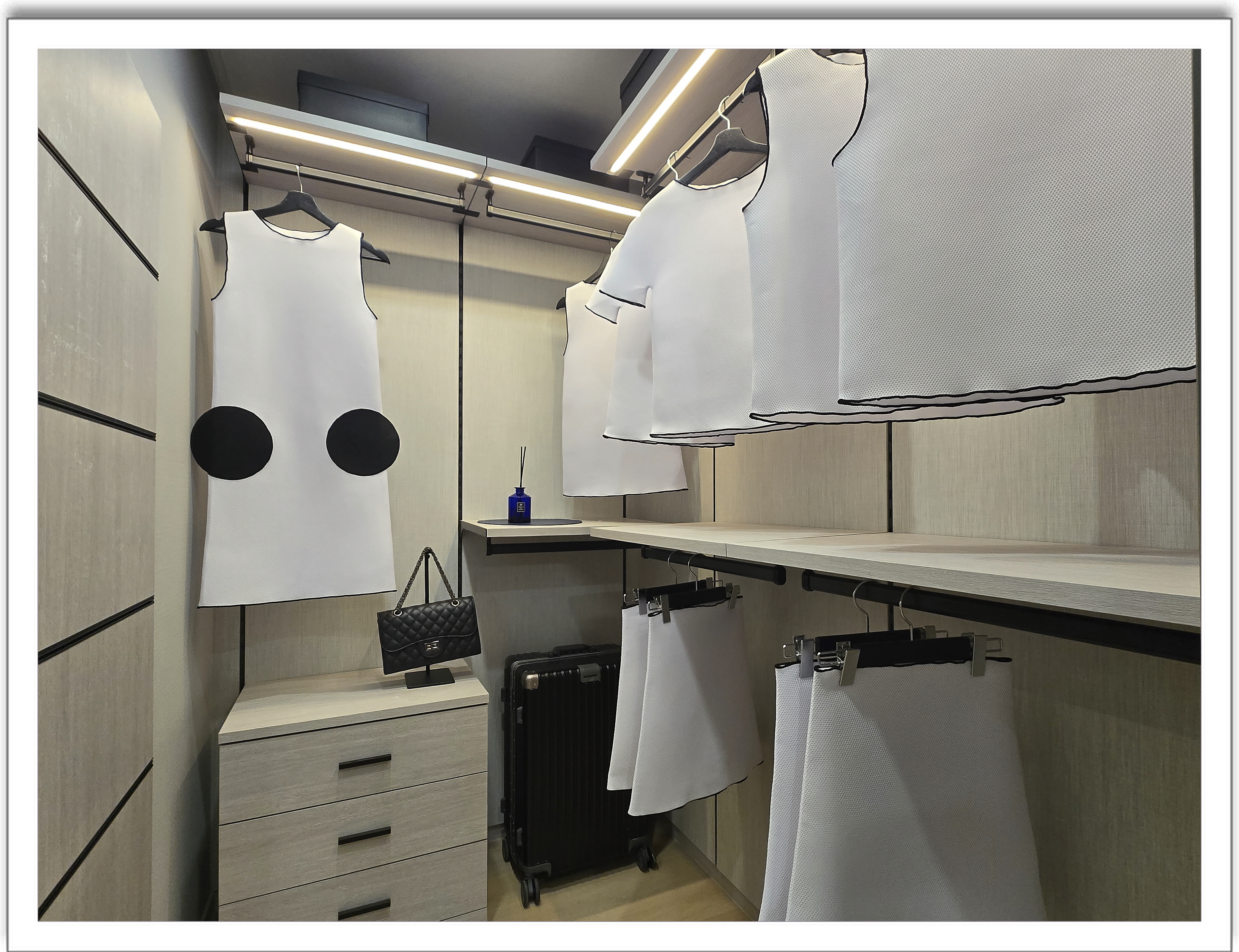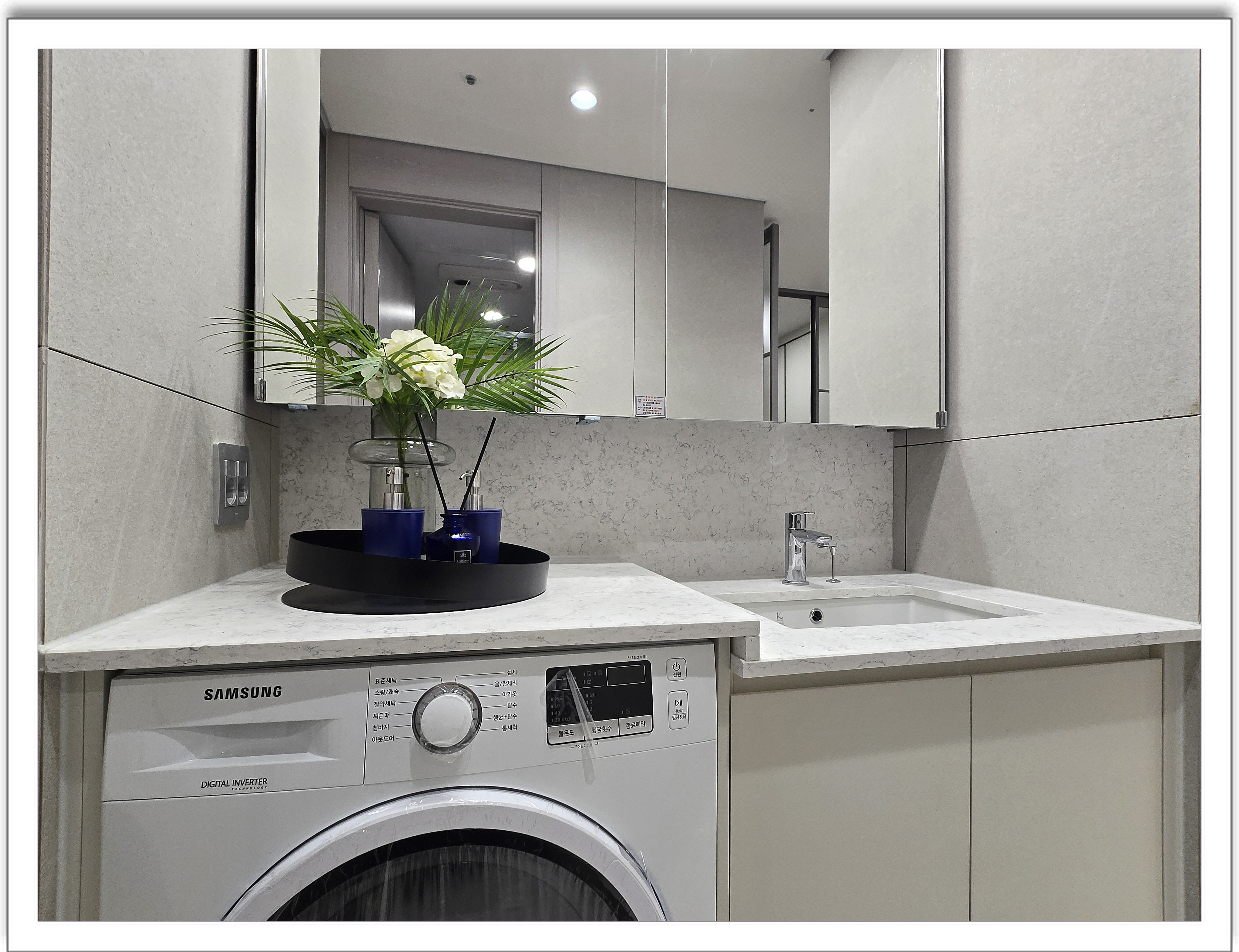 또한 빌트인의 다양한 가전제품이 기본으로 제공되는데요, 전기오븐, 정수기, 렌지후드, 음식물처리기, 인덕션, 세탁기, 김치냉장고, 냉장고, 냉온풍기, FCU 등이 설치되어 있습니다.