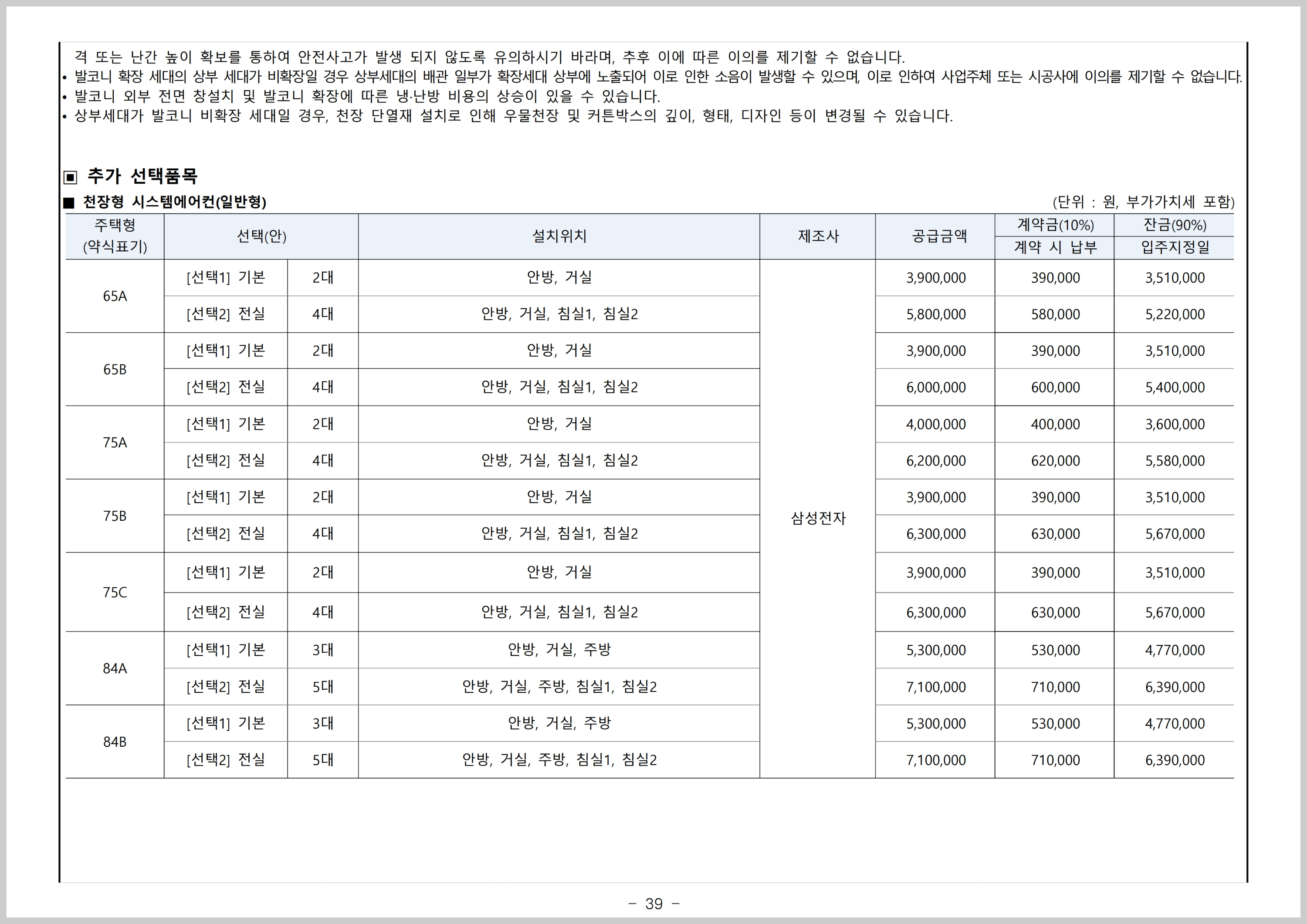 그리고 풍무역 롯데캐슬 시그니처는 다양한 옵션을 선택할 수 있는데요, 가장 많이 하는 시스템에어컨의 경우 일반형 기준 84A타입 기준에 안방, 거실, 주방, 침실1, 침실2 설치를 하였을 경우 710만원 입니다.