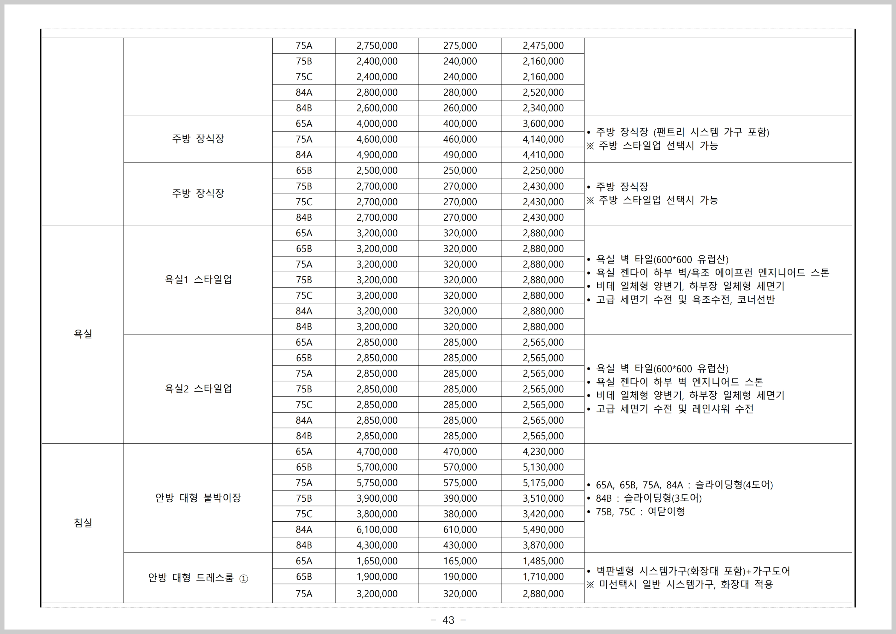 가구나 마감재 붑누도 다양하게 옵션을 선택할 수 있는데요, 가격표는 위 표를 참고하시기 바랍니다. 거실이나 펜트리, 주방 스타일업 등 다양한 옵션을 선택할 수 있습니다.