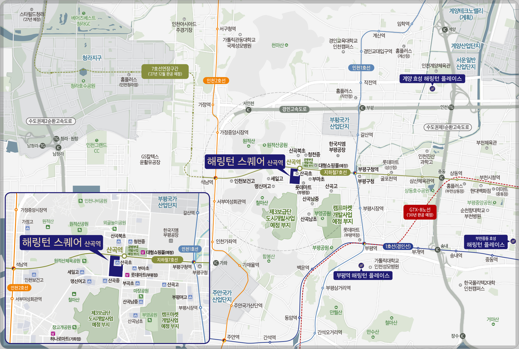 퍼펙트 역세권에 GTX-B노선도 착공 예정이며 공병단 부지 개발로 복합쇼핑몰 등도 계획되어 있습니다. 주변으로 약 15,000세대 산곡& 청천지구 신흥주거타운이 완성되는 곳으로, 제3보급단-부평캠프마켓 부지 공원화 및 도시개발사업 또한 추진중에 있습니다.