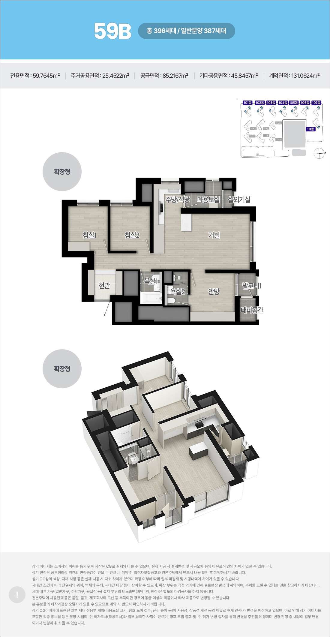 해링턴 스퀘어 산곡역 59제곱미터 25평형은 3개의 방이 있는 구조로 2개의 욕실을 갖추고 있습니다. 2~3인 가족이 생활하기에 충분한 공간 입니다.