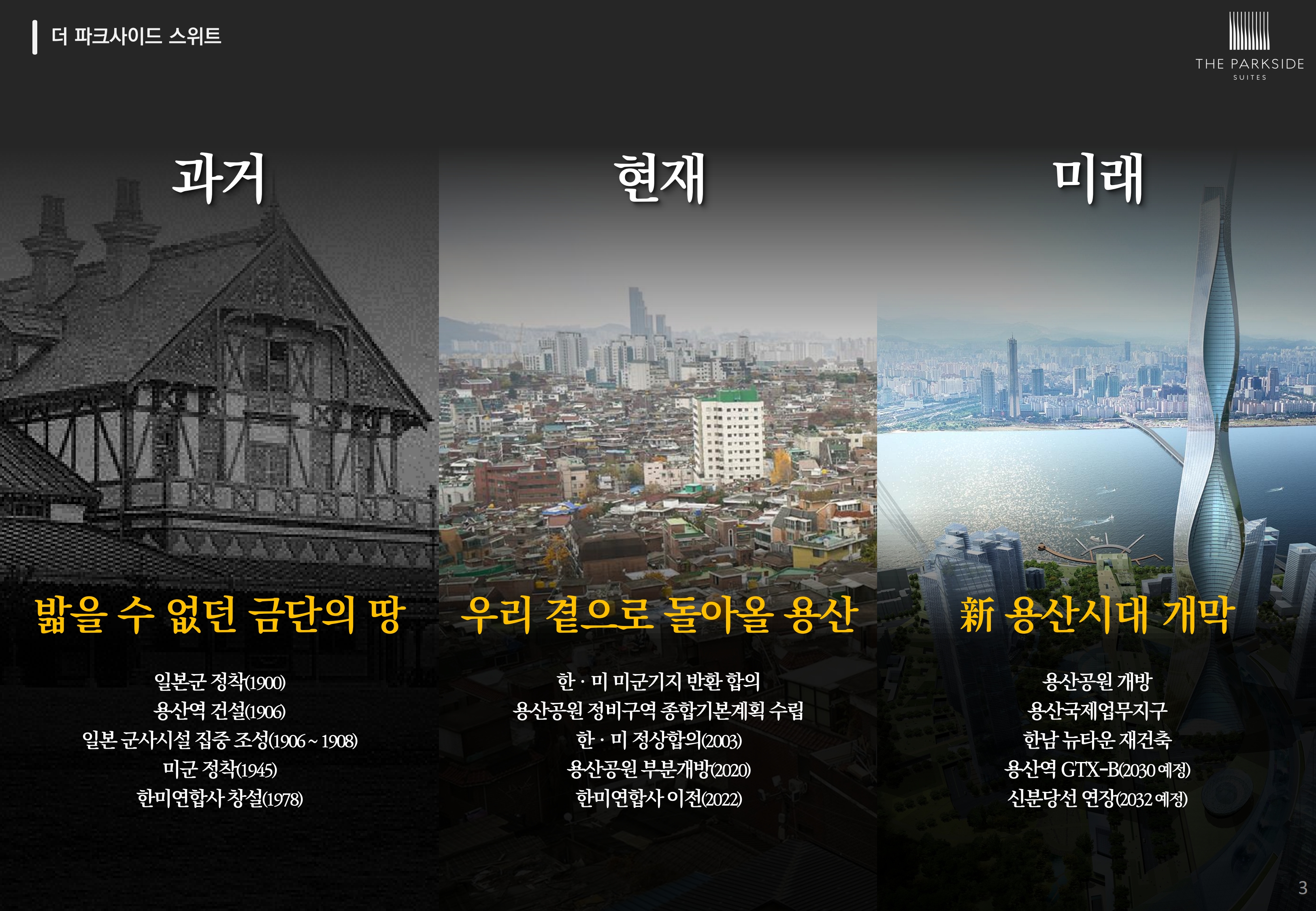 용산공원 부분개방, 한미연합사 이전 등 현재의 시대를 지나서 용산공원 개방, 용산국제업무지구, 한남뉴타운 재건축, 용산역 GTX-B(예정), 신분당선 연장(예정)으로 대한민국의 중심 용산 시대를 열어갑니다.