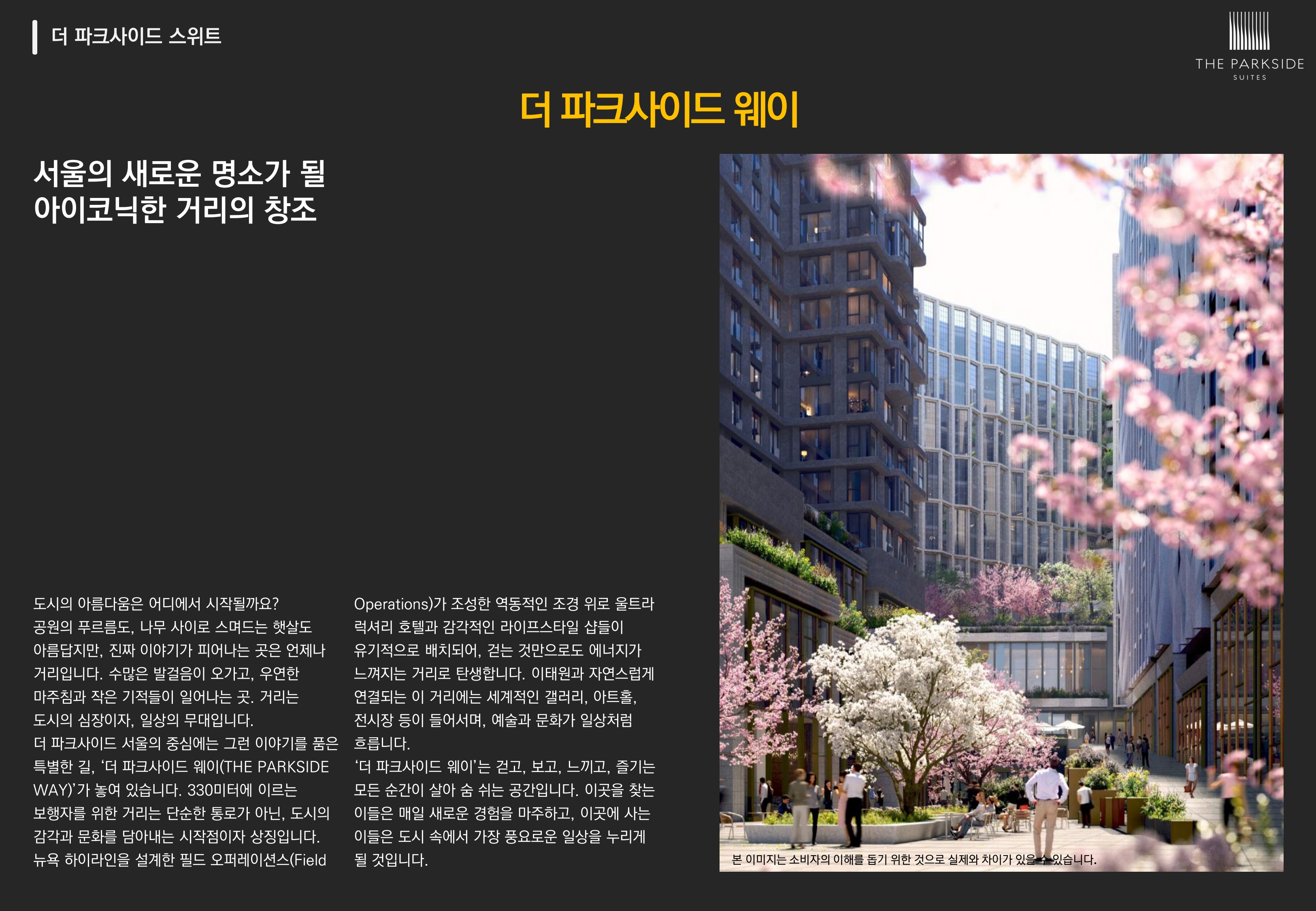 서울의 새로운 명소가 될 아이코닉한 거리를 선보이는 더 파크사이드 웨이는 걷는 것만으로도 에너지가 느껴지는 거리로, 걷고, 보고, 느끼고, 즐기는 모든 순간이 살아 숨 쉬는 공간입니다.