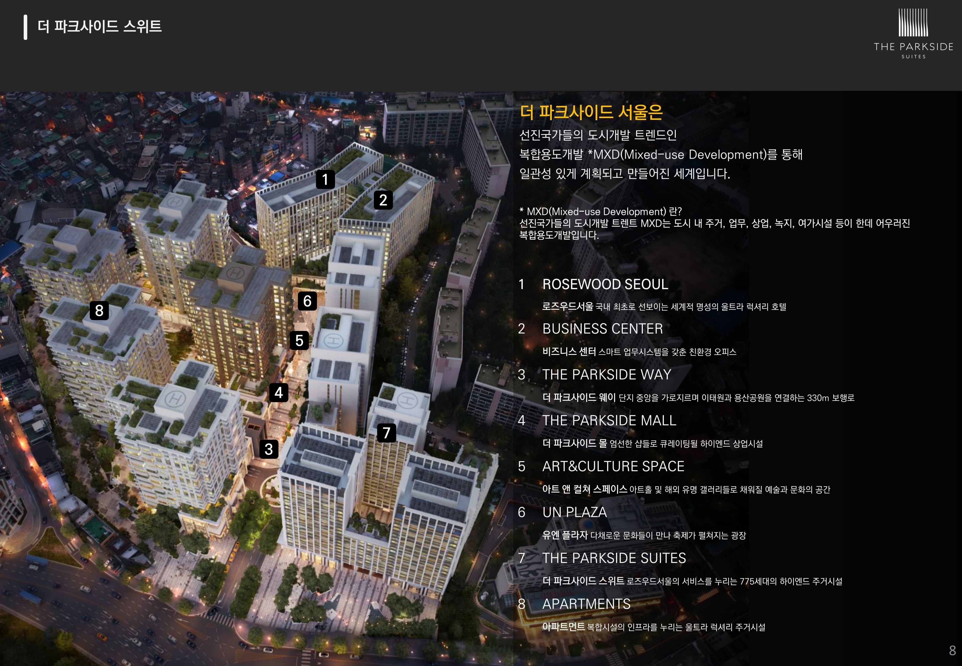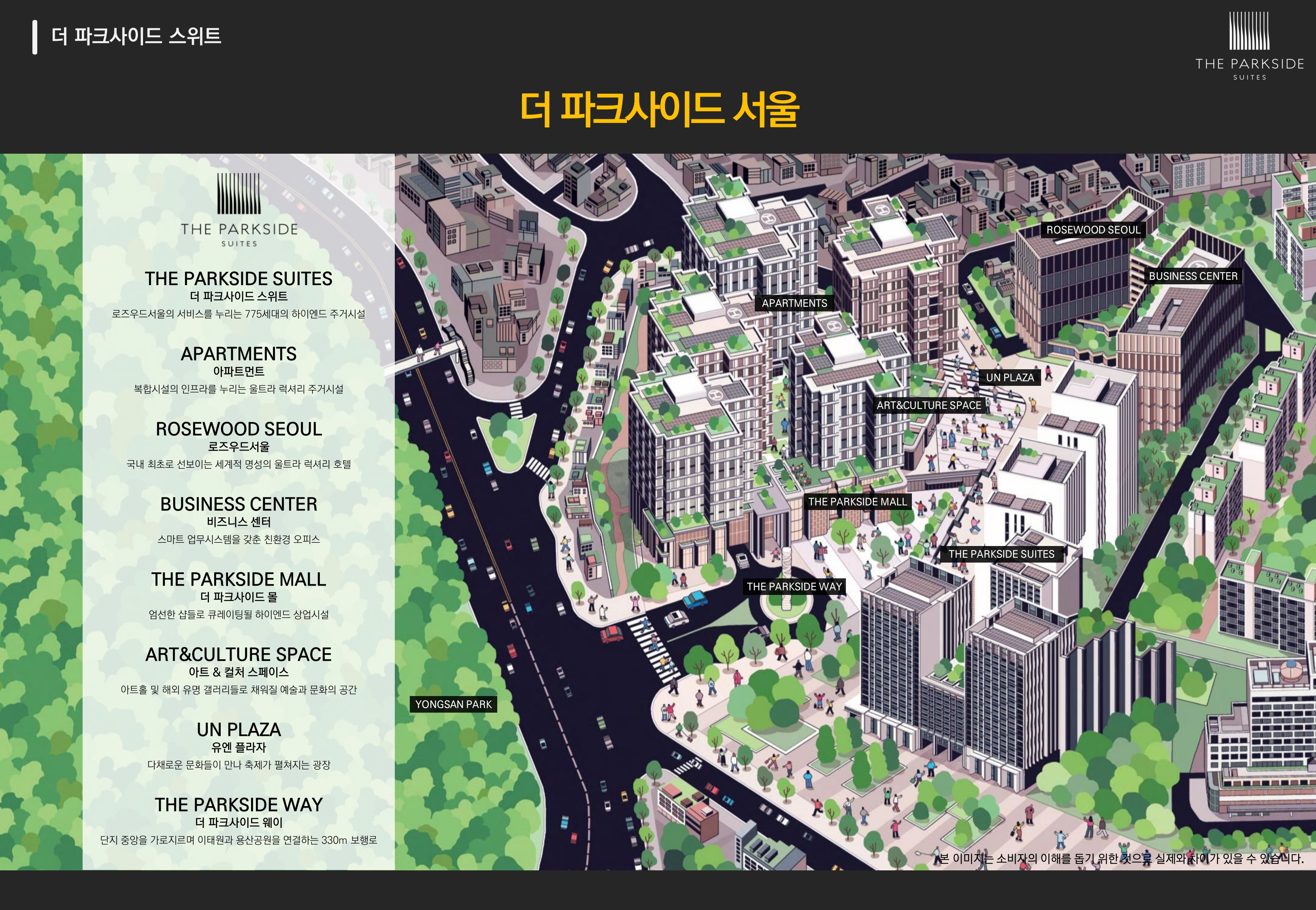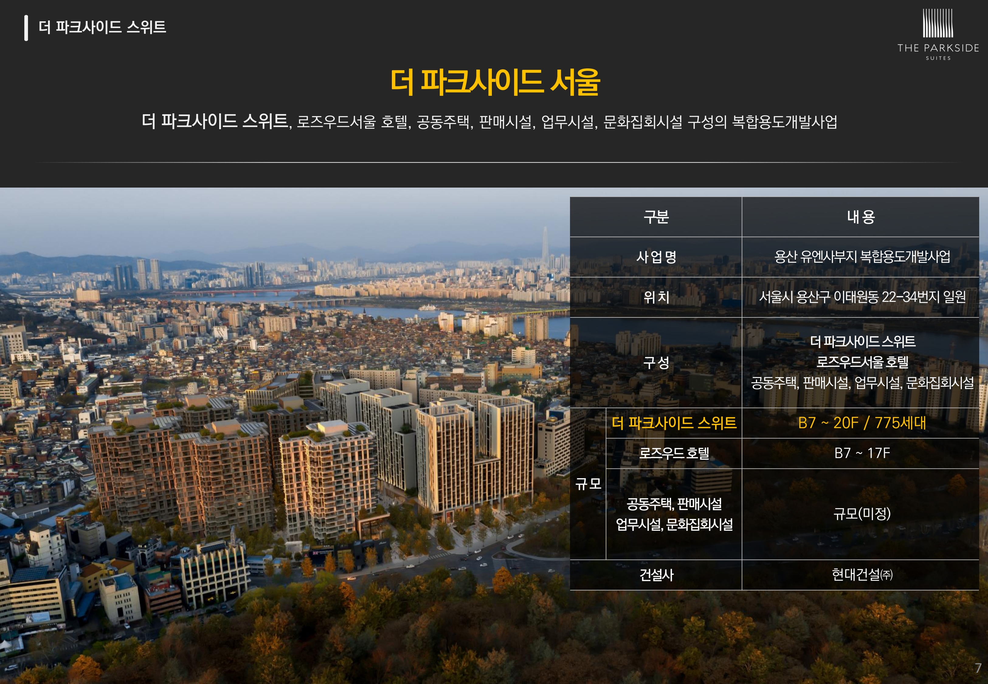 더파크사이드 서울은 서울시 용산구 이태원동 22-34번지 일원에 더파크사이드 스위트 오피스텔, 로즈우드서울 호텔, 아파트, 판매시설, 업무시설, 문화집회시설로 구성되며, 현대건설이 시공합니다.