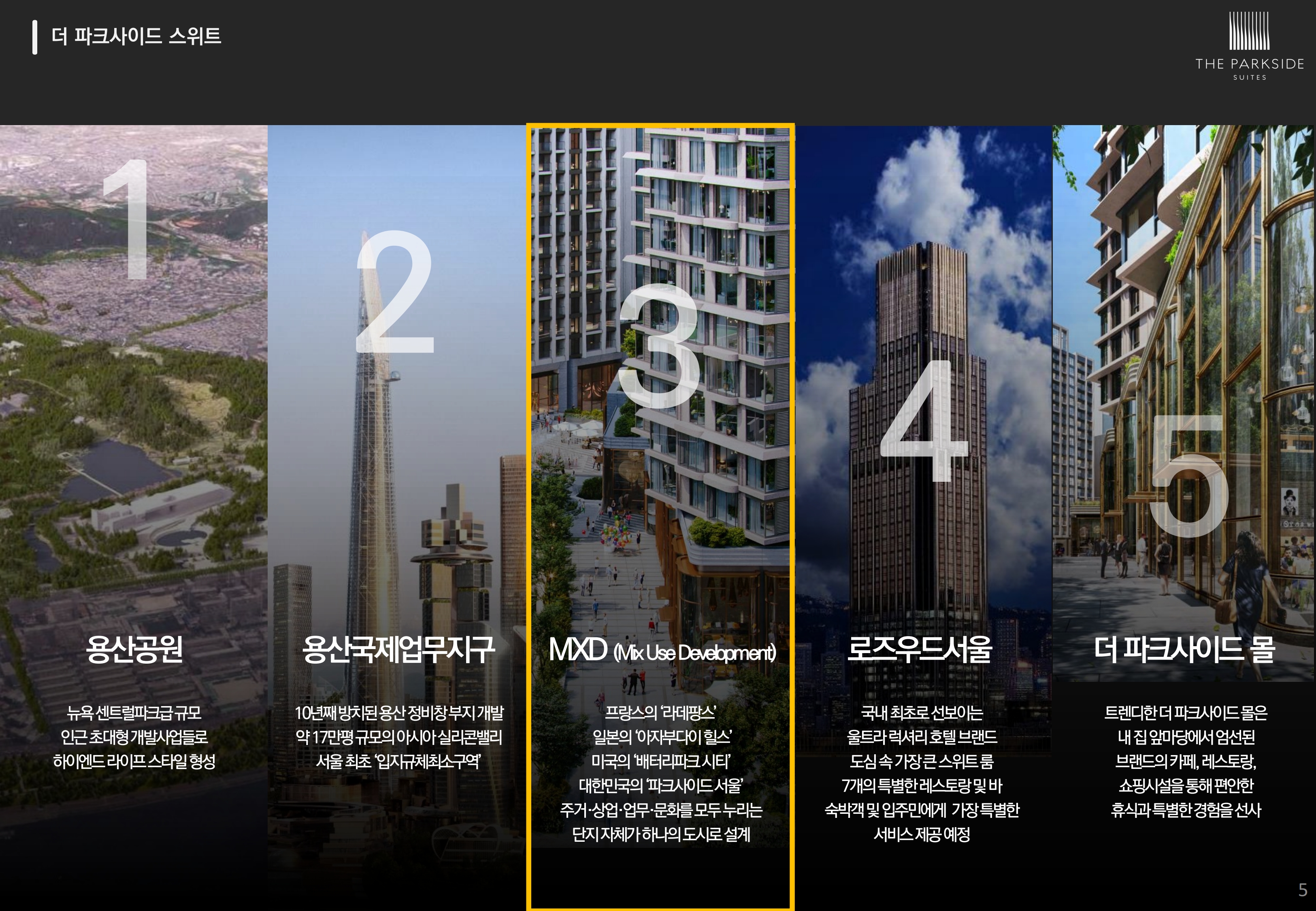 더파크사이드 스위트는 용산공원, 용산국제업무지구, 국내 최초로 선보이는 울트라 럭셔리 호텔 브랜드 로즈우드 서울과 더파크사이드 몰까지 오직 파크사이드 서울에서만 누릴 수 있습니다.
