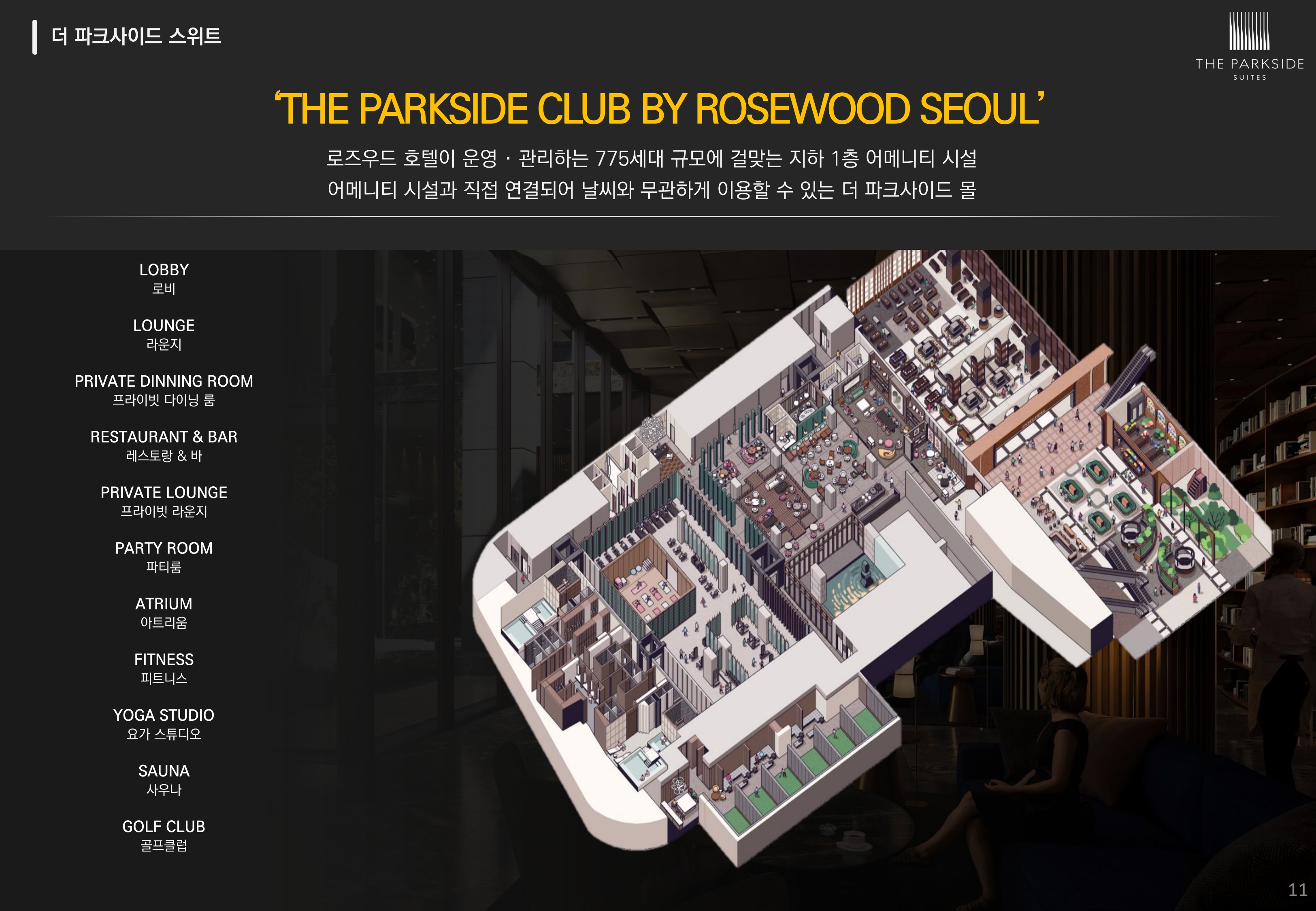 또한 더파크사이드 스위트 오피스텔 지하 1층 어메니티 시설은 로비, 라운지, 프라이빗 다이닝룸, 파티룸, 아트라움, 피트니스, 요가 스튜디오, 사우나, 골프클럽 등 775세대의 규모에 걸맞는 규모로 갖춰집니다.
