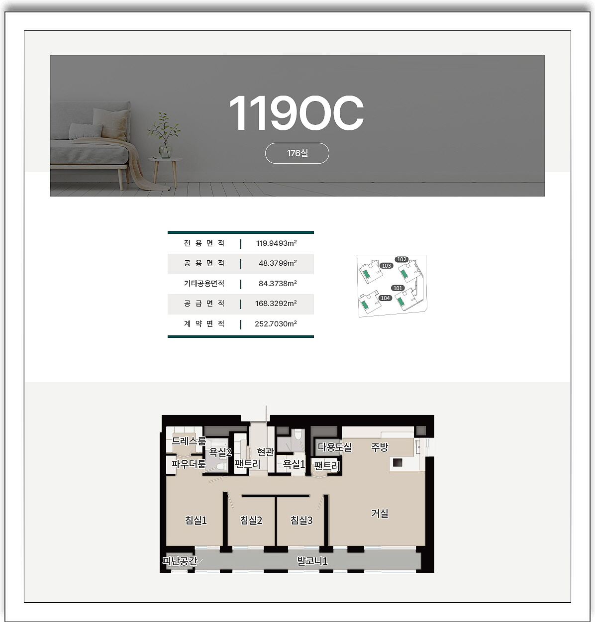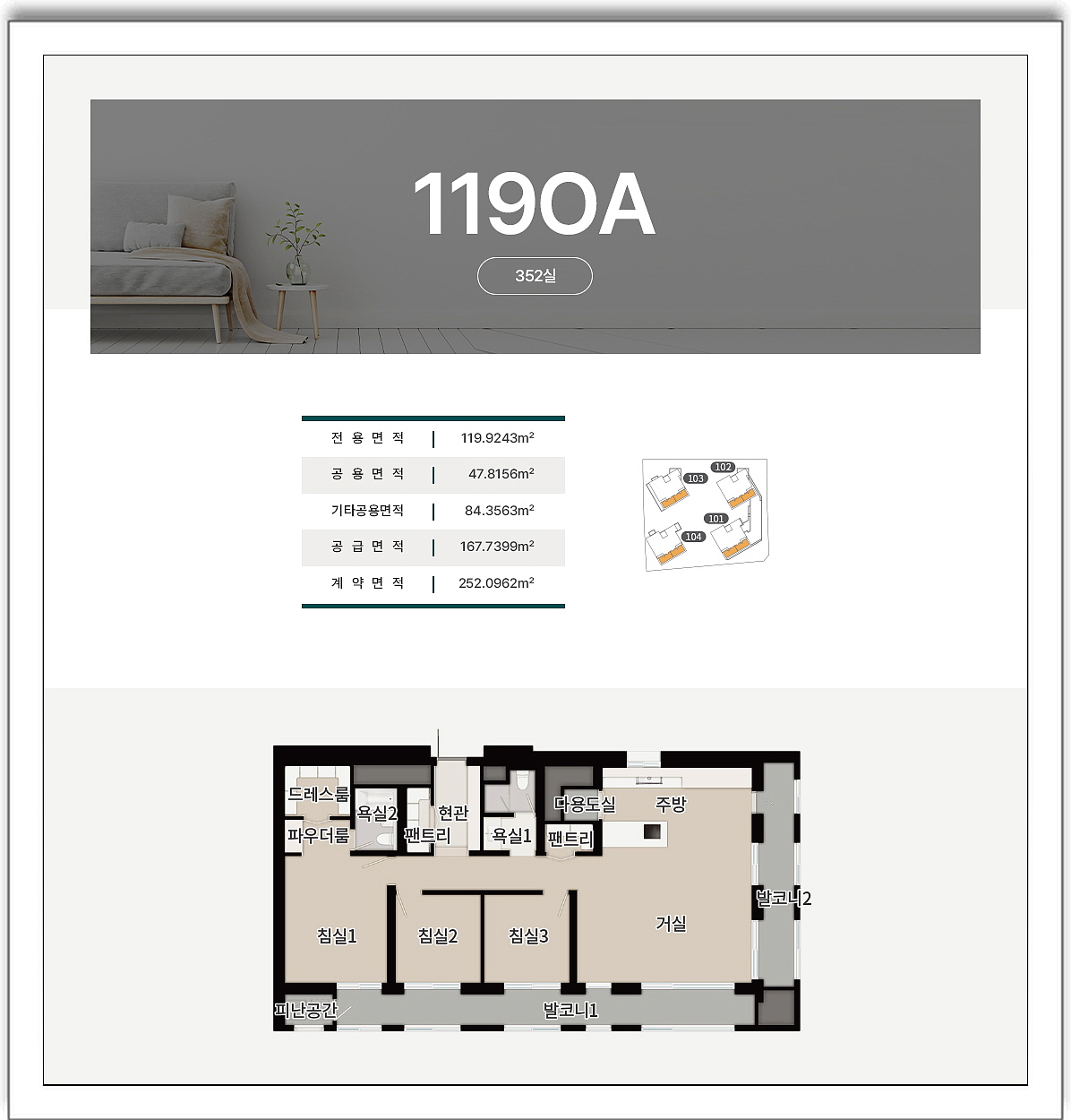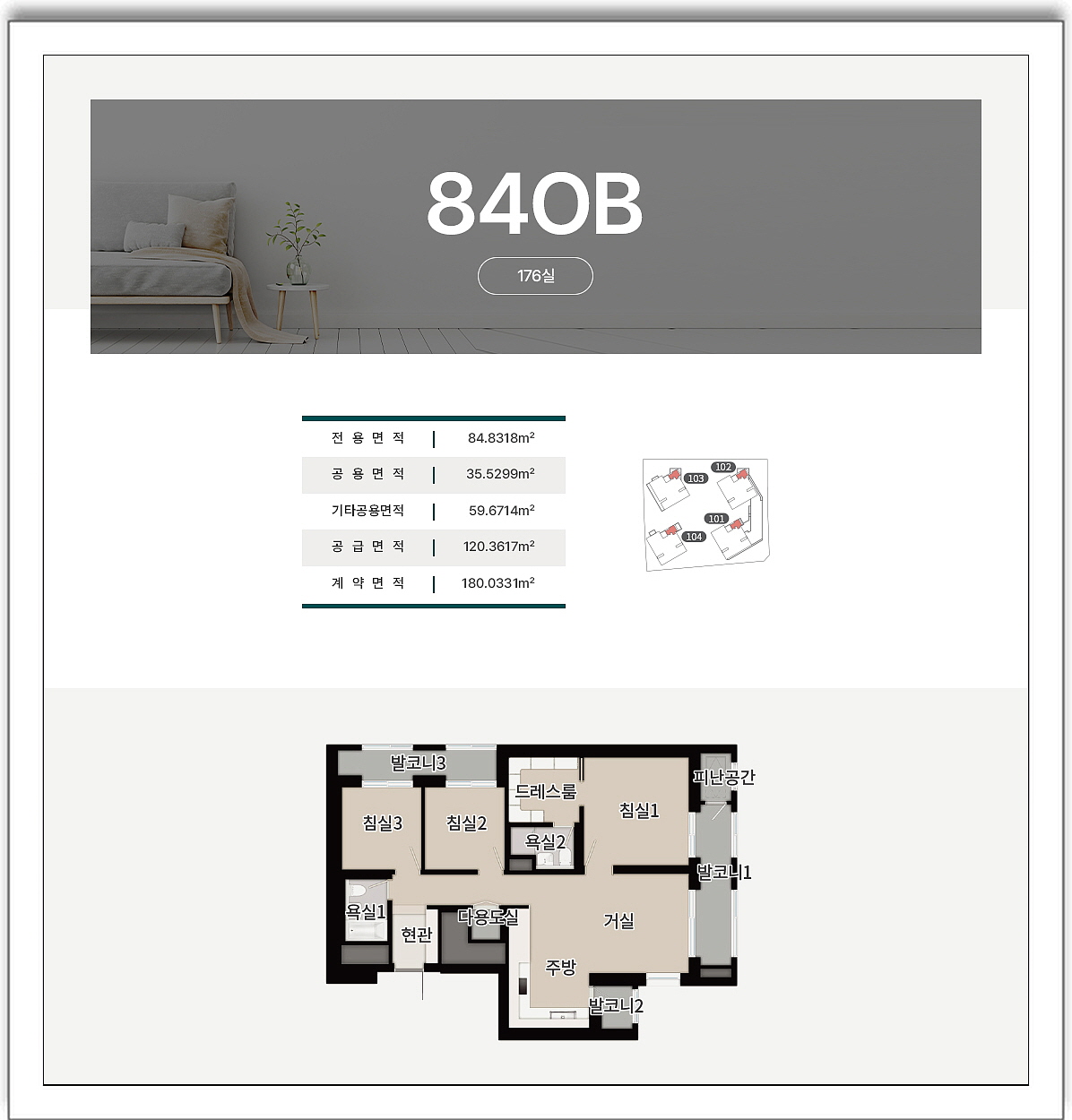 세대는 전용면적 84제곱미터 타입과 119제곱미터 타입으로 총 5개의 타입으로 구성되는데요, 84제곱미터는 3개의 방과 2개의 욕실이 있는 구조로 거실과 침실에 발코니가 갖춰집니다.