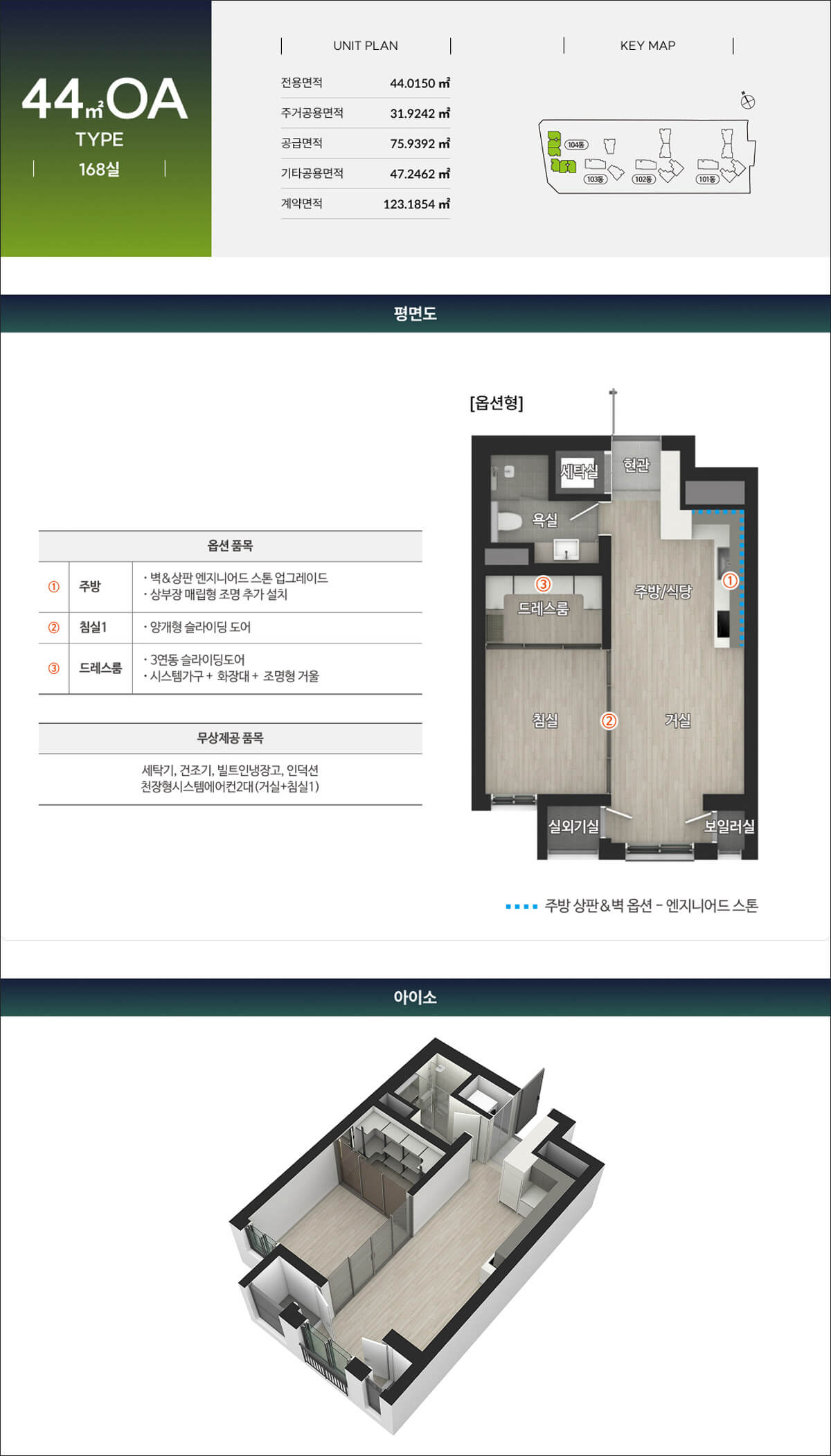 세대타입은 오피스텔 44OA타입은 분리형 거실과 방으로 구성되어 있어서 1~2인 가구가 생활하기에 적합한 면적 입니다. 세탁기, 건조기, 빌트인냉장고, 인덕션, 천장형시스템에어컨 2대(거실+침실1)이 무상으로 제공됩니다.