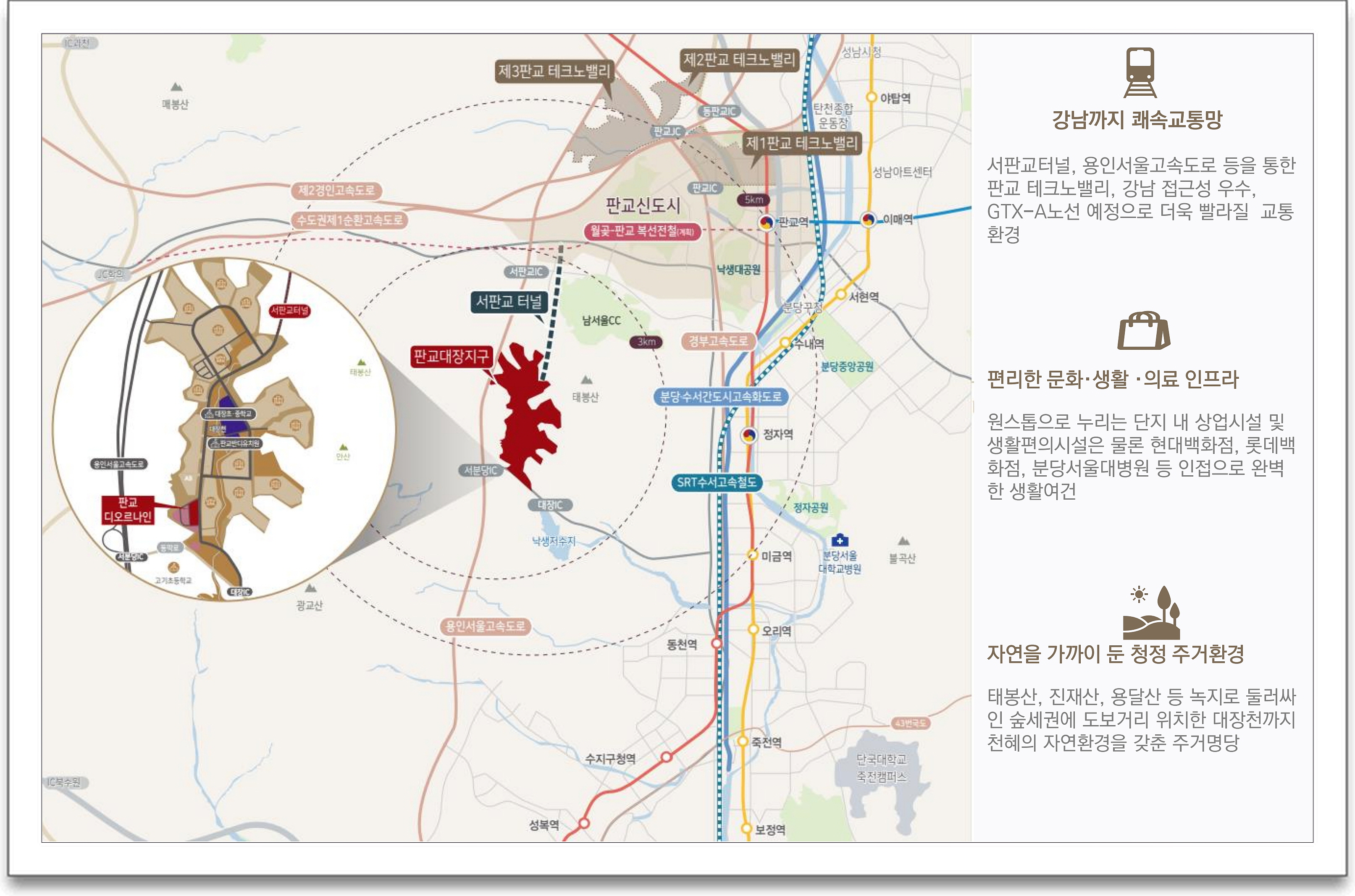 판교 디오르나인은 판교 대장지구에 위치하는데요, 판교 테크노밸리가 가까운 직주근접 환경이 조성되어 있습니다. 서판교터널을 통해서 판교까지 빠르게 접근이 가능하며, 서분당 IC, 대장 IC, 서판교 IC, 수도권제1순환고속도로, 제2경인고속도로, 57번국도, 경부고속도로, 용서고속도로 등이 인접합니다.