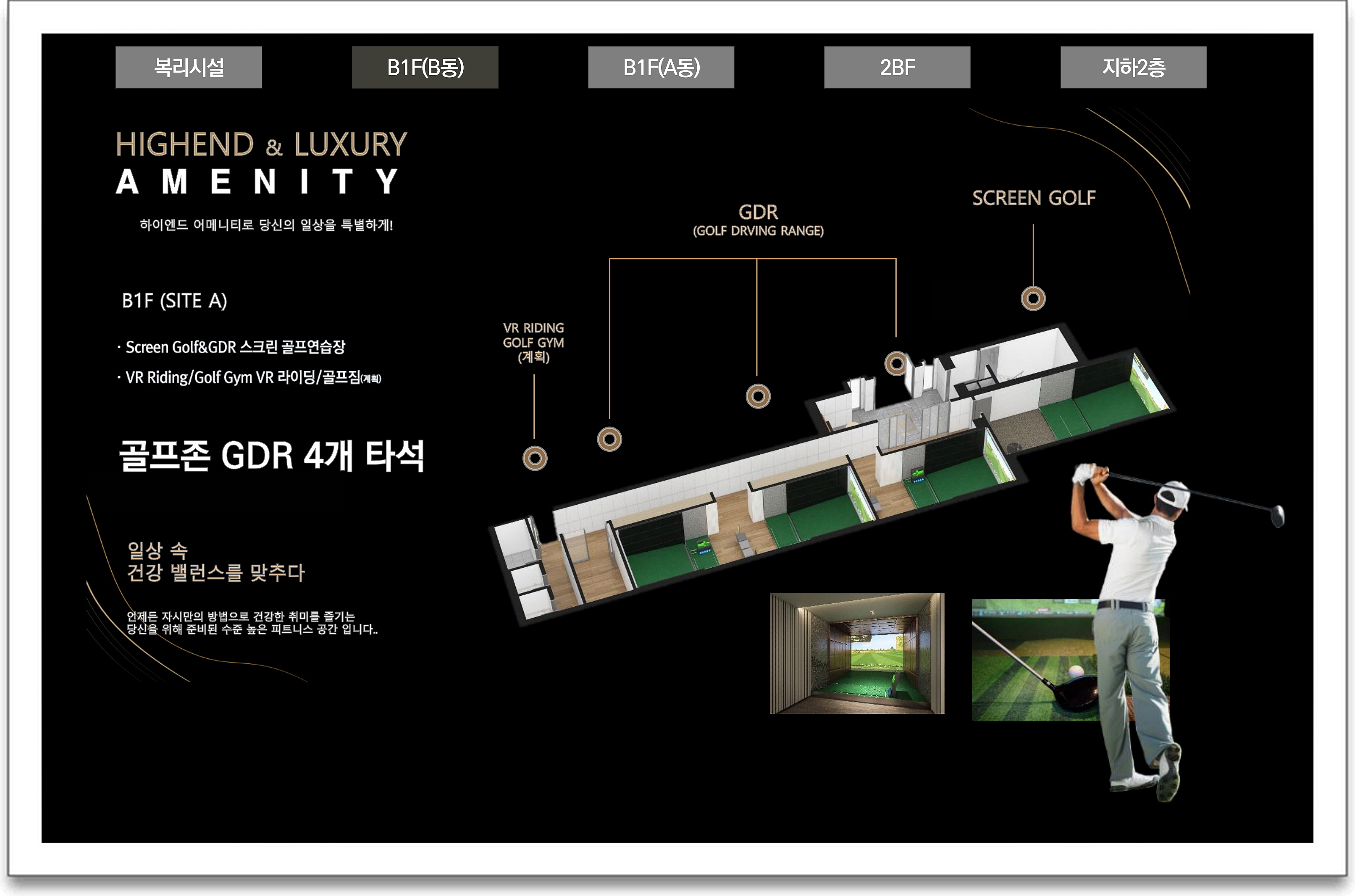 단지에는 GDR 4개 타석이 있는 스크린골프연습장과 라운지카페, 라운지바, 다이닝룸 등 하이엔드 어메니티 시설이 있어서 품격있는 라이프를 누릴 수 있습니다.