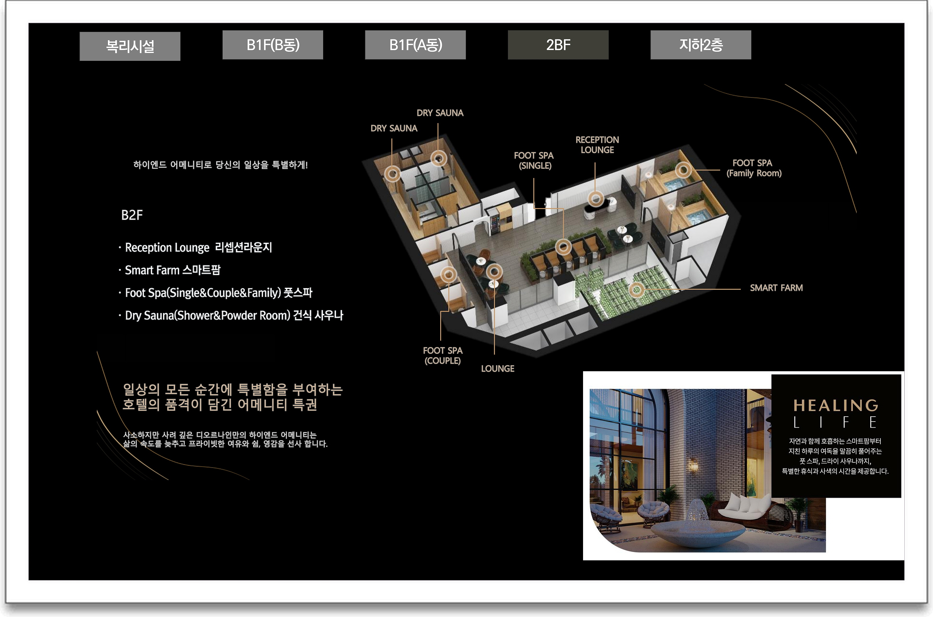 그리고 단지에는 다양한 시설이 갖춰져 입주민 분들이 편하게 이용할 수 있는데요, 주변에 있는 타 오피스텔과는 비교 불가한 다양한 시설이 갖춰집니다.