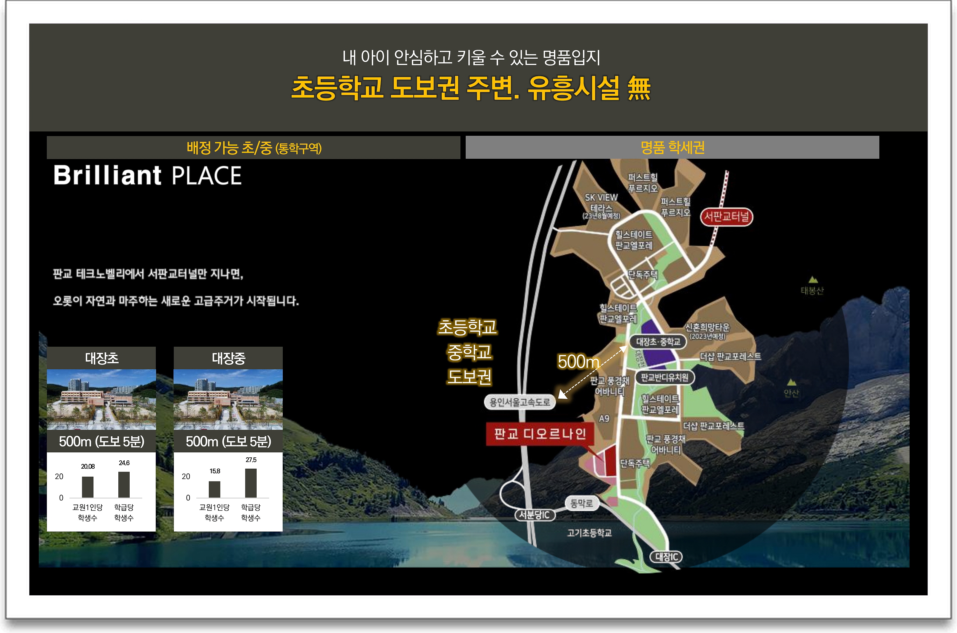 무엇보다도 판교 디오르나인은 주변으로 500m 도보 5분 거리에 대장초등학교와 대장중학교가 위치한 우수한 학군이 조성되어 있으며, 유흥시설도 주변으로 없어서 아이들의 교육환경이 뛰어납니다.
